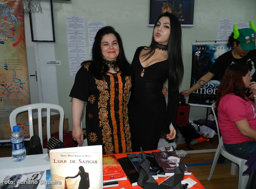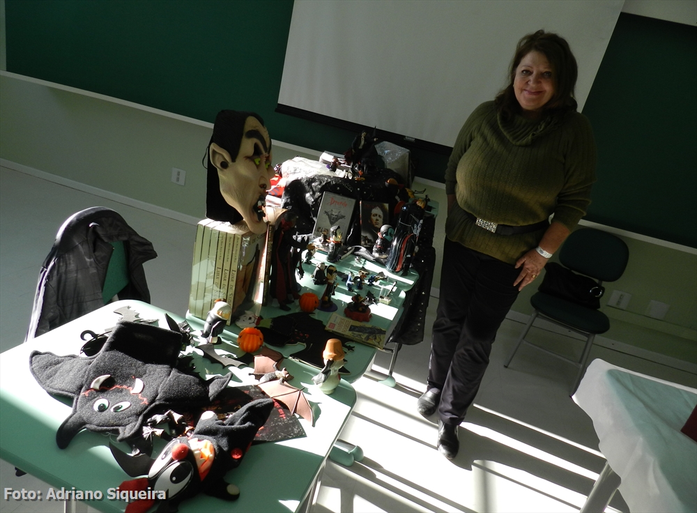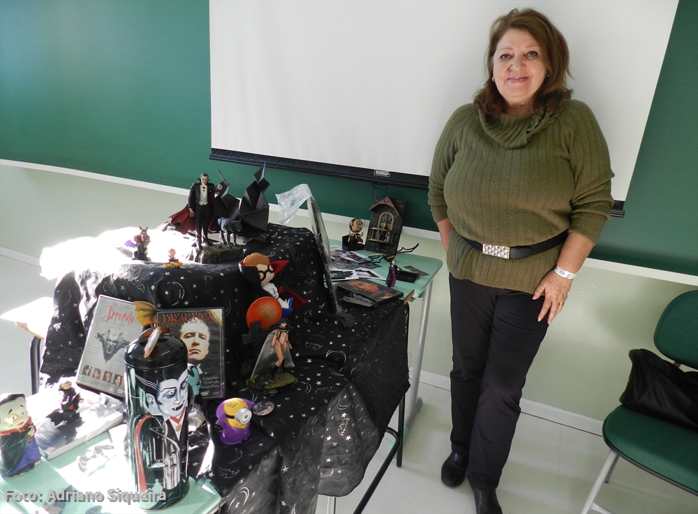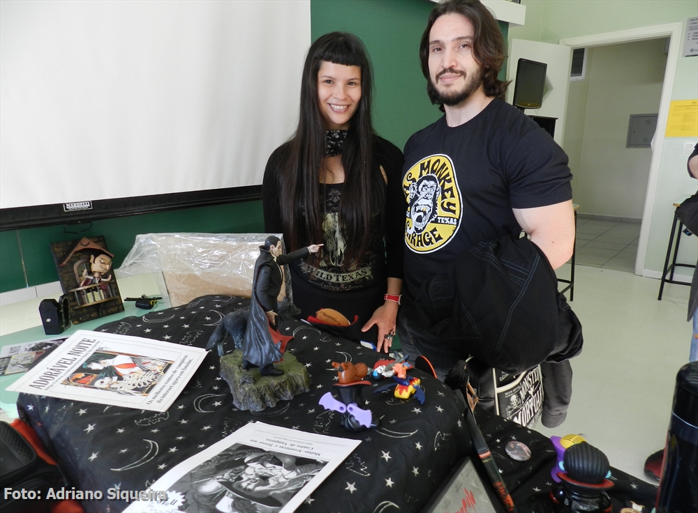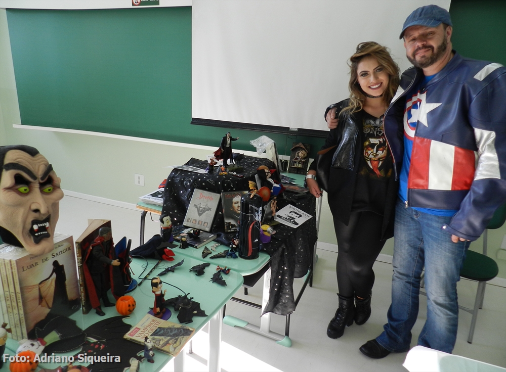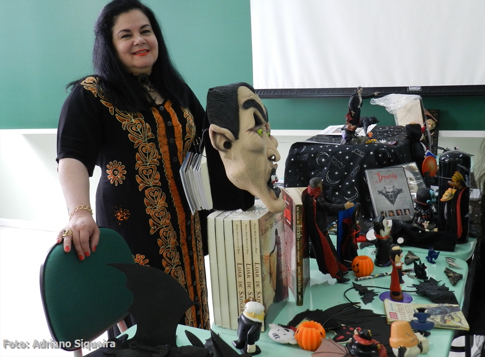 Dione M. S. Rosa visitando o estande Museu dos Vampiros